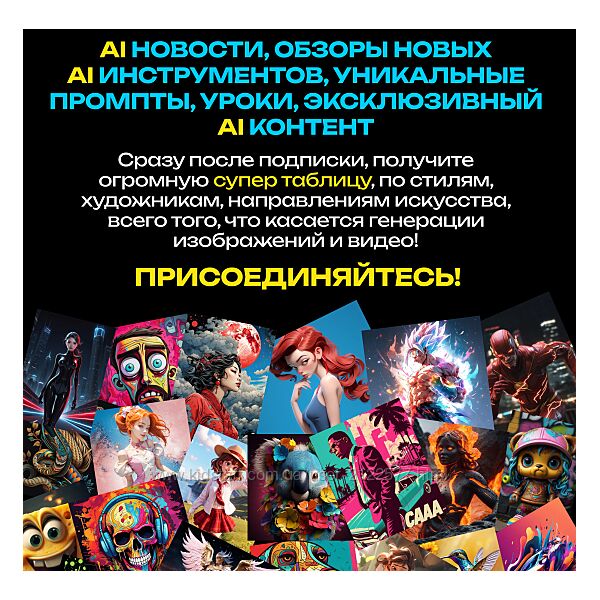 После подписки получите уникальную, таблицу по стилям, художникам, направлениям искусства, настройкам камер и еще много чего!Раз в две недели закрытый стрим в телеграм, где я даю уроки по генерации видео, изображений, хаки, отвечаю на вопросы.