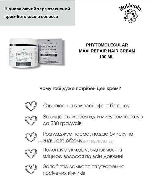 Подробное описание: Крем-ботокс для волосся з термозахистом Molecula Maxi Repair Hair Cream