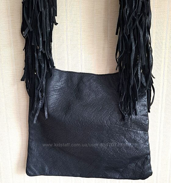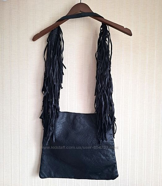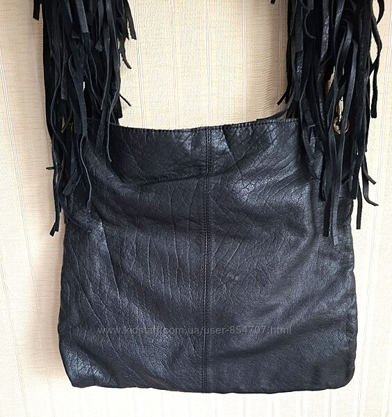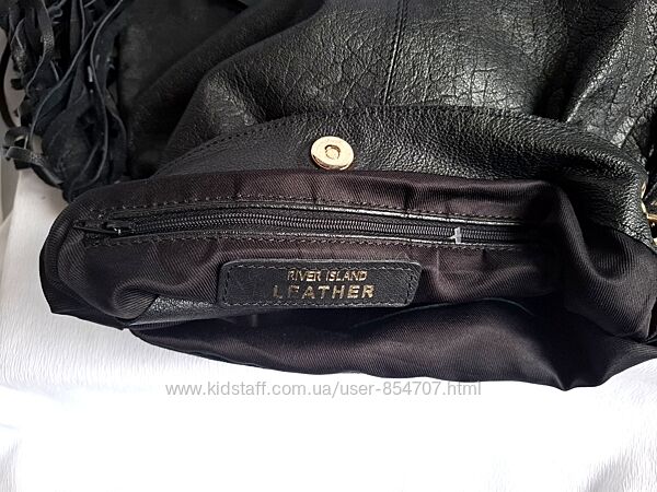 Сумка женская кожаная черная через плечо River IslandМодная и стильная сумка кросс боди изготовлена из качественной, мягкой натуральной кожи. На подкладке. Одно отделение на магнитной кнопке, с тремя карманами, один из них на молнии. Ремешок декорирован бахромой. Размеры (в см): ширина внизу 38, сверху 32; высота 33. Длина ручки 108 см.
