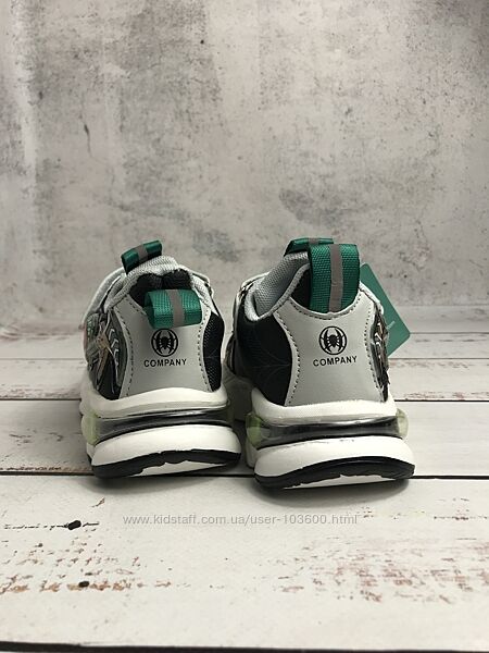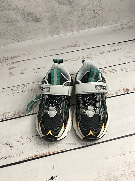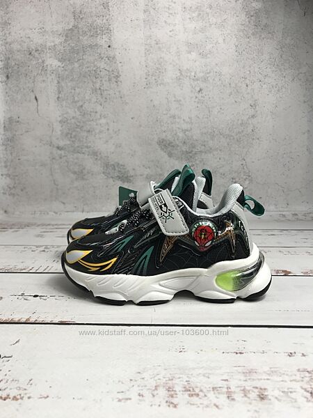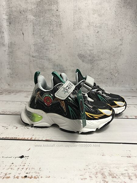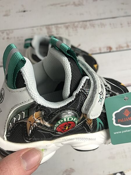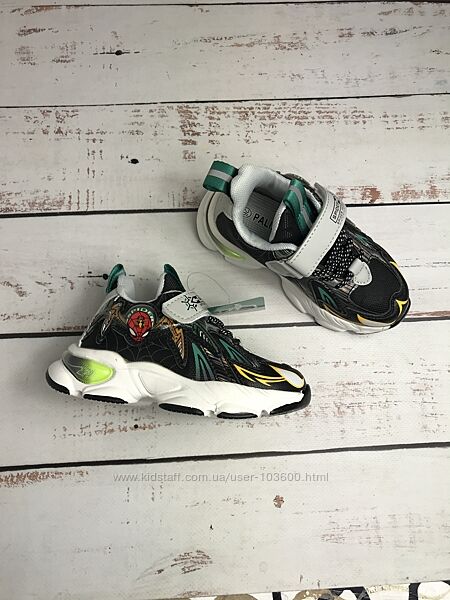 З комбінованим верхом з сучасної штучної шкіри та текстилю: перший матеріал використовується для зон заднику і мису, а другий – для бокових сторінЗ мерехтливими вогниками на наліпці з людиною-павуком, тому ваш маленький бунтівник буде помітний навіть у темряві