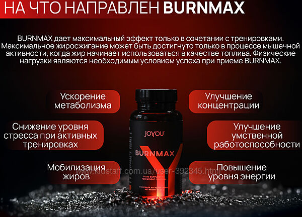 ПРИМЕНЯТЬ ПЕРЕД ТРЕНИРОВКАМИ ИЛИ ФИЗИЧЕСКОЙ НАГРУЗКОЙ ! BURNMAX - это помощник в управлении весом. Усиленная формула, с тщательно подобранными ингредиентами, поддерживает метаболизм и помогает достичь желаемых результатов.Преимущества: