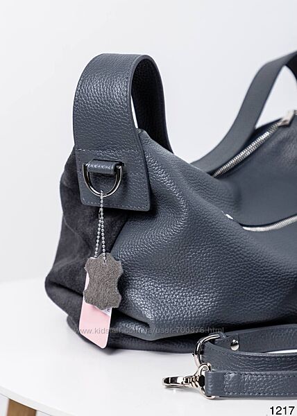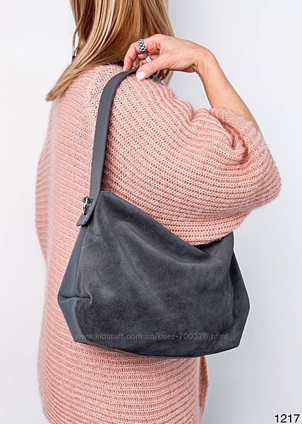 Сумка жіноча, натуральна замша/шкіра - флотар, сіра. Одне велике відділення з карманами + зовнішний карман на змійці. Довгий пасок. Український виробник. Розмір 32*28*11 см.