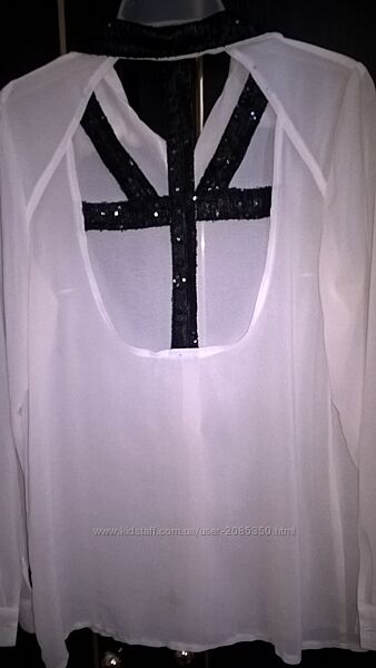 Блуза белая нарядная с открытой спиной.Воротник и на спине обшита паетками черными.