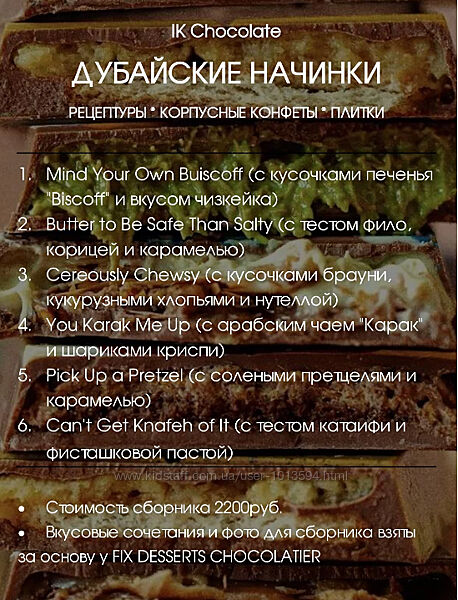 первый - как я вижу по описанию в соцсетях и на фото состав начинок - на первенство и точное повторение не претендую, но гарантирую максимальное попадание во вкус первоисточника - срок хранения маленький, но я даю рекомендации как его (продлитьвторой - те же вкусы, но написанные с учетом всех правил составления начинок для конфет / плиток - срок хранения до 60 дней (уверена, вы оцените этот вариант - кроме длительного срока хранения, отсутствие приторности и мегакалорийности с сохранением вкусового сочетания Fix - bv[j)В сборнике есть мои личные рекомендации к процессу приготовления и хранения (дубайского чуда, ссылки на формы и ингредиенты - в общем всё то, что вам необходимо для комфортного приготовления насущного шоколадного хита