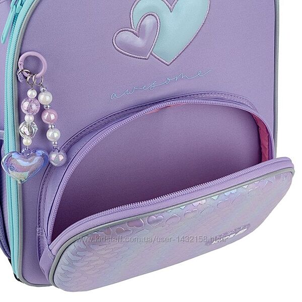 Трендова форма рюкзака вирізняється плавними лініями та надає йому унікального сучасного вигляду. Об’ємна передня кишеня виглядає стильно, вміщує в себе пенал або ланчбокс та дозволяє розмістити більше речей в основному відділенні. Рюкзак водночас компактний та місткий. А його оздоблення з фактурним декором та модними підвісками зачаровує з першого погляду.