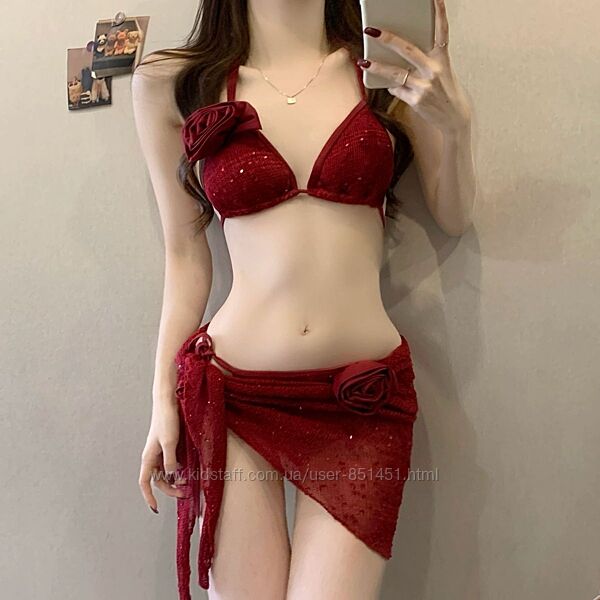 Подробное описание: Бордовий ефектний в´язаний купальник з парео юбкою квітко