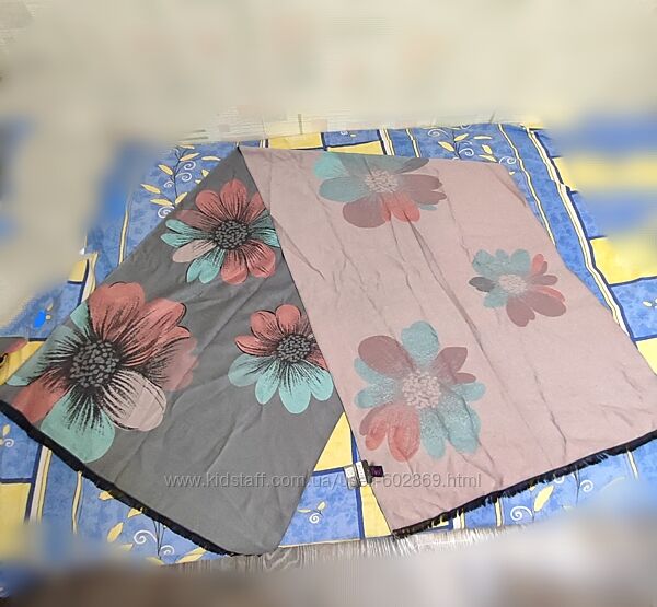 Женский палантин двусторонний с цветами. шолк/шерсть 50/50