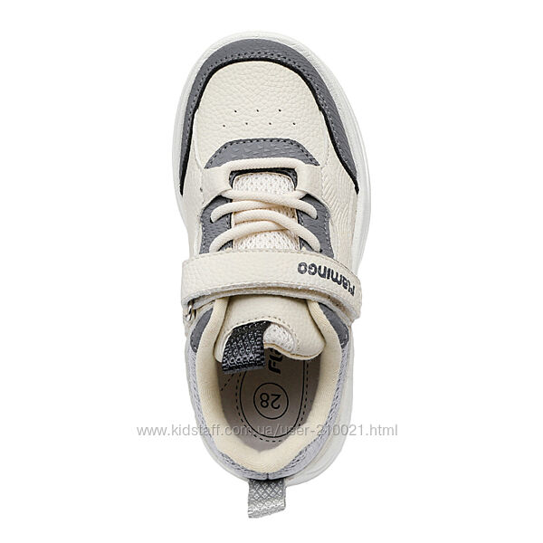 Дитячі кеди сіро-бежевого кольору. Вони мають липучку та шнурки-резинки, що забезпечує зручну фіксацію на нозі. Верхня частина виконана з комбінованих матеріалів з різними візерунками. Підошва класична білого кольору з декількома хвилями.-дуже легенькі