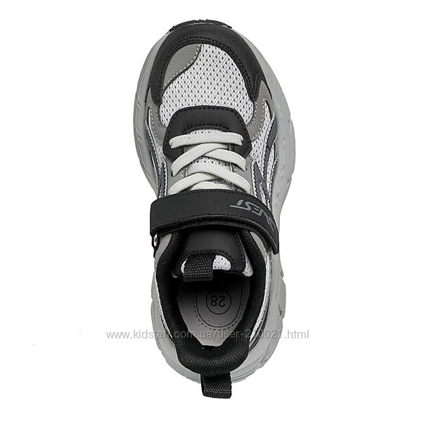 Підліткові кросівки QWEST сірого кольору з чорними та білими деталями. Модель виконана з комбінованих матеріалів - екошкіри та текстилю, що забезпечує вентиляцію. Застібка на липучці та еластичні шнурки роблять взування швидким і зручним. Підошва має амортизуючі властивості та спеціальний рельєф для кращого зчеплення з поверхнею та захисту носової частини взуття. Дизайн доповнений цікавими дизайнерськими лініями, підкреслюючи стиль та динамічність моделі.
