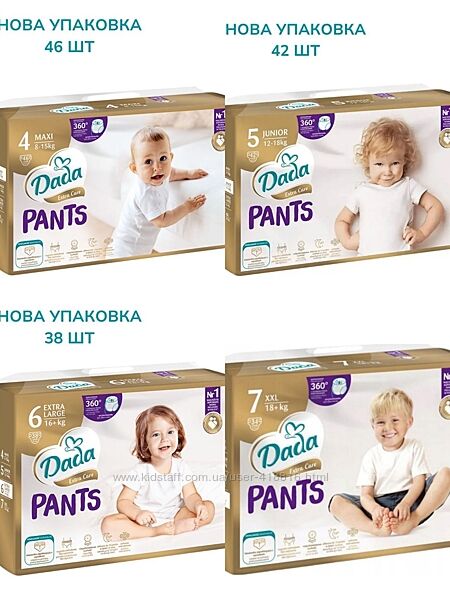 Підгузки - трусики Dada Extra Care Pants 4 MAXI, для дітей вагою 8-15 кг, 46 шт-370грнПідгузки-трусики DADA Extra Care Pants (5) junior 12-18кг 42 шт—370грн