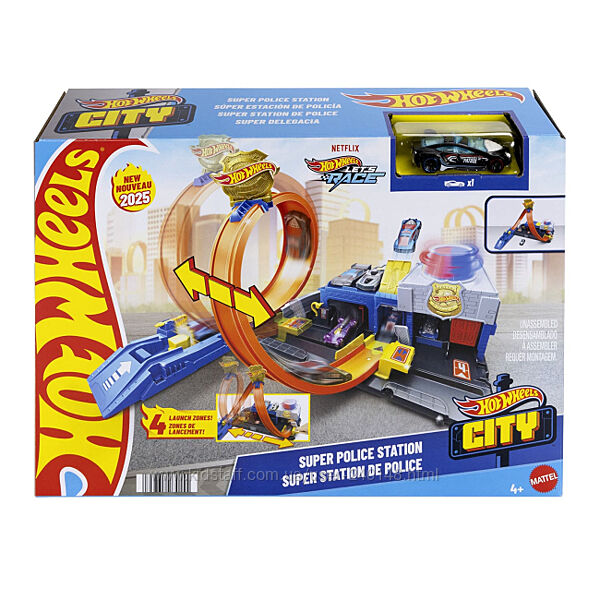 Ігровий набір Hot Wheels City Суперполіцейський відділок з можливістю змінювати маршрут!Перш ніж вирушати в дорогу, завантажте іграшкову поліцейську машинку масштабом 1:64 у пускову установку, де можна навіть заправитися завдяки заправному шлангу.
