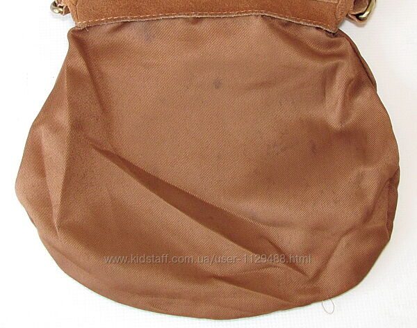 Эффектная, самой актуальной модели, компактная, но достаточно вместительная. Закрывается клапаном на магнитную кнопку, под ним плоское отделение и основное объемное отделение, в нем карман на молнии. Выполнена из мягкой натуральной замши отличного качества в цвете "кэмэл", декорирована замшевой бахромой, фурнитура желтого металла.