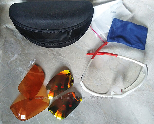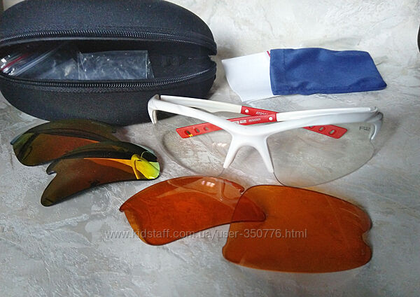 самые популярные в своё время, UV 400 - 100% защита от ультрафиолета, Cat. 0-3, оправа пластиковая, гибкая, лёгкая, анатомический антискользящий носоупор и заушники, три вида сменных пластиковых линз-фильтров: обычные прозрачные, радужные зеркальные от яркого света и оранжевые для пасмурного освещения (придают чёткость видимости и яркость), легко вставляются в комплекте: мягкий мешочек (для линз) и жесткий футляр отличное состояние, как новые, царапин нет