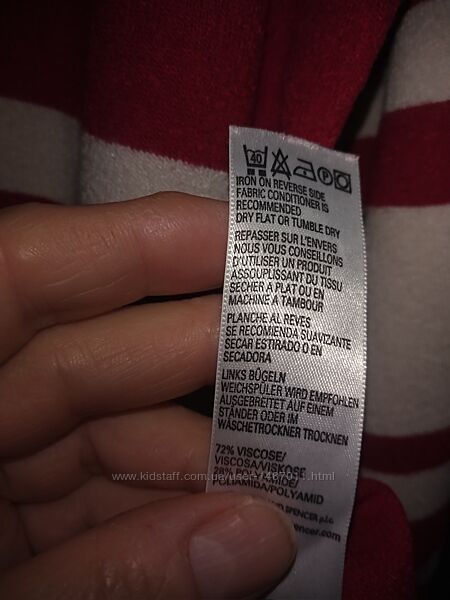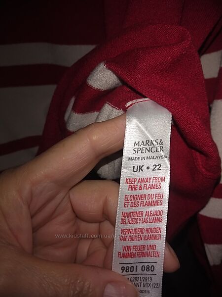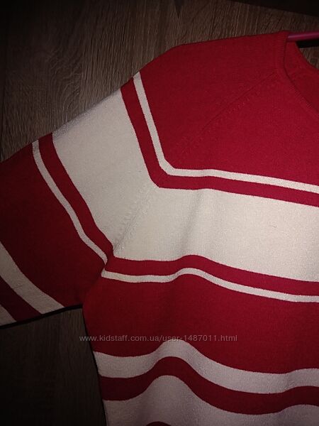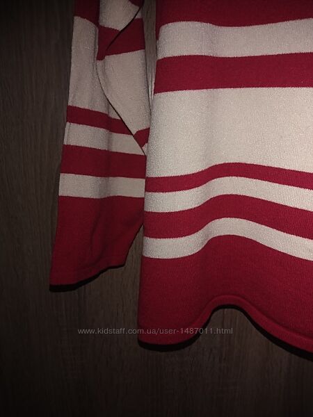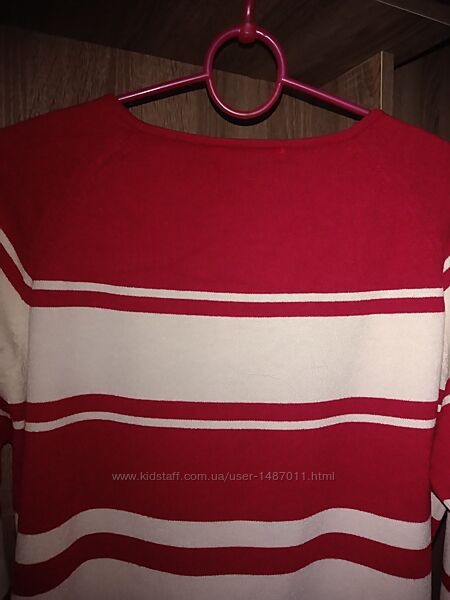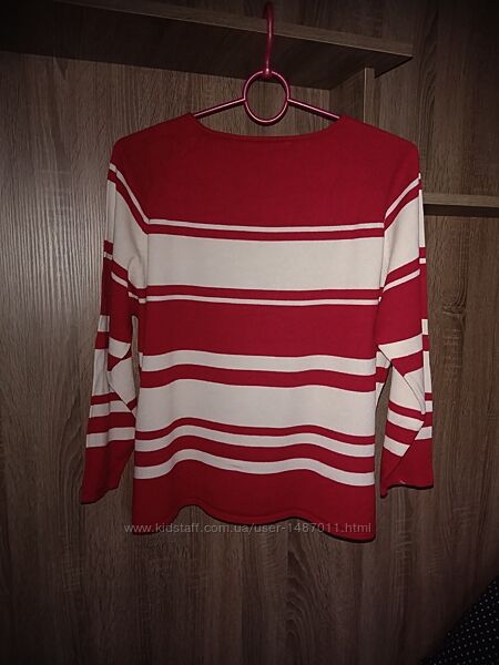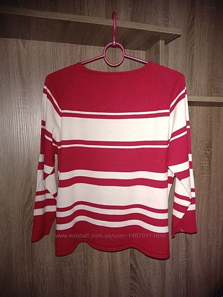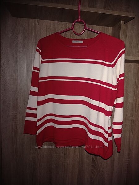 Джемпер свитер кофта Marks & Spencer женский. Размер, британский 22, соответствует нашим 50 -52. Цвет красный, с горизонтальными широкими белыми полосками. Силуэт прямой, круглый вырез горловины, рукав "реглан". Материал - тонкий мягкий трикотаж, состав: 72% вискоза, 28% полиамид. Хорошо держит форму, после стирки не требует утюжки.Длина 58см, окружность груди 112см, окружность бёдер 118см, длина рукава (от горловины) 61см.