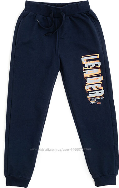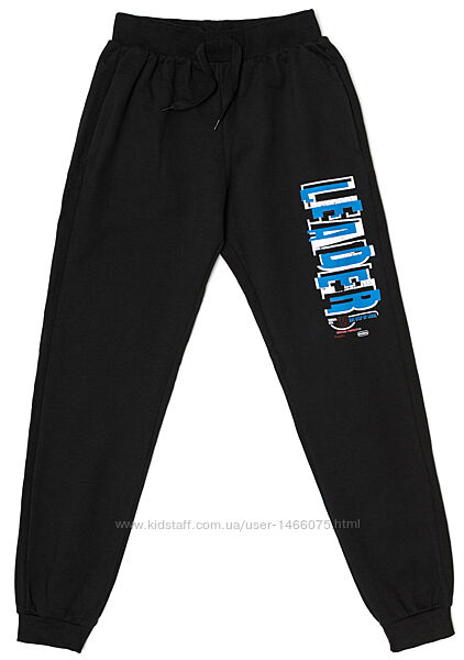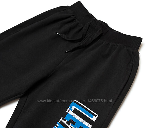 Штани на манжетах, з двома передніми прорізними кишенями, без застібок. Еластичний широкий пояс і манжети - рібана (в подвійну трикотажну «гумку»), забезпечать комфорт і оптимальну посадку по фігурі. Пояс додатково посилений широкою вставленою «гумкою». Шнурок - декоративний. Штани прикрашені якісним, контрастним принтовим накатом.