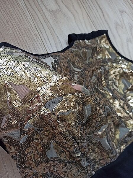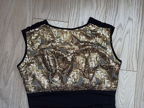 365. Сукня в ідеальному стані, без нюансів. Верх фатин, підкладка - віскоза. Щільна, не просвічує, тягнеться. Сукня дуже зручна. Ліф розшитий золотими паєтками, все на місці, ніде нічого не відірвано.Плечі 40 см