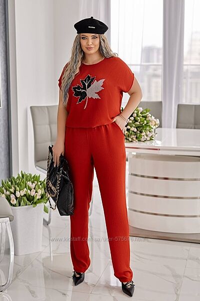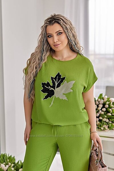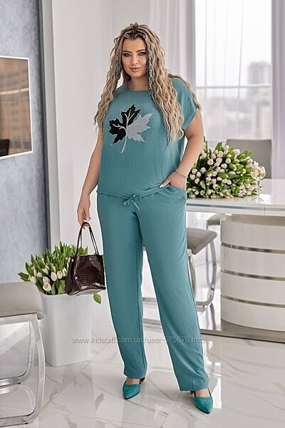 Блуза вільного крою з трендовим принтом, прикрашена стразами нереальної якості, камінчики сяють на променях світла. Блузка знизу на куліскі, можна затягнути, а також можна носити вільно. Брюки вільного крою, в талії на гумці, з карманами.