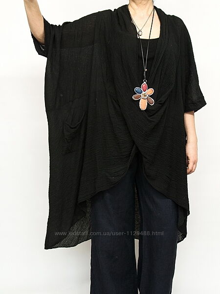 Эдакая разлетайка с кандибобером, легкая, необычная, очень свободного кроя, с накладными карманами. Спереди эффектная драпировка, сзади роскошные фалды. Выполнена из натуральной дышащей чуть жатой ткани, идеально подходит для создания современных динамичных многослойных образов.