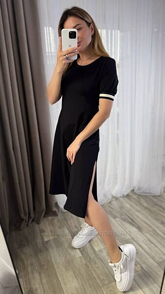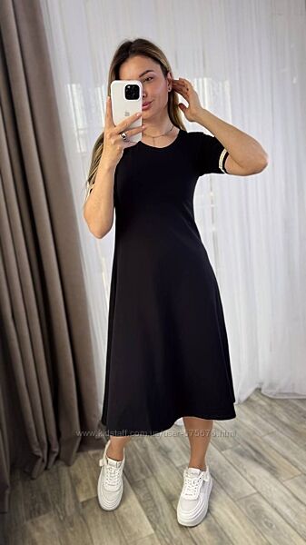 Сукня до низу спідниця розширена (трапеція), з боків розрізи, на рукавах оздоблення лампас