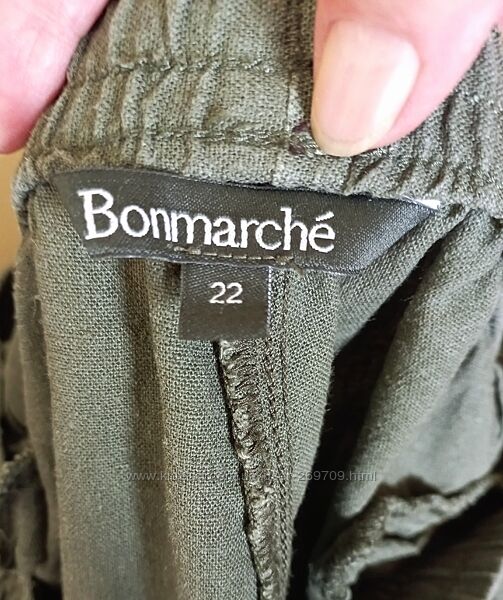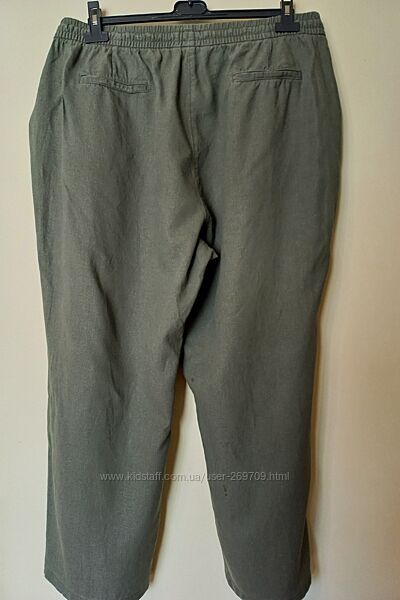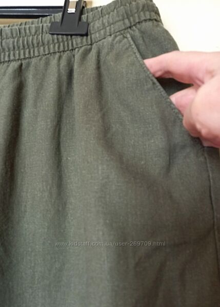 Чудові лляні брюки, колір хакі, стан ідеальний без нюансів, розмір вказано 22, довжина 105 см , внутрішній шов 72 см, ,ПОБ 70 см, ПОТ 52-58см, пояс гумка , посадка 36 см/48 см , штанина внизу 28 см, верху 40 см