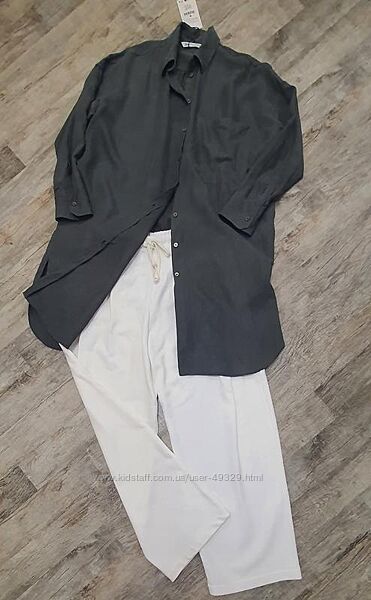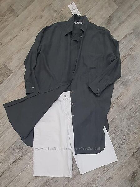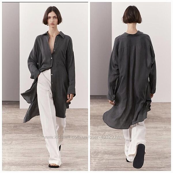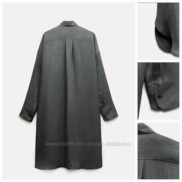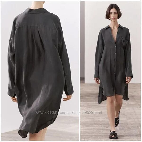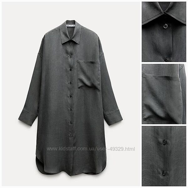 Струмуюча подовжена блуза-сукня Zara zw collection. Об’ємного крою із сорочковим коміром, опущеними проймами та довгими рукавами. Застібається на ґудзики спереду. Накладна кишеня спереду, ґудзики на манжетах і асиметричний закруглений низ. Шикарний антрацитово-сірий колір.Натуральний склад з 100% ліоцелу. Розмір XS-S, але насправді буде на