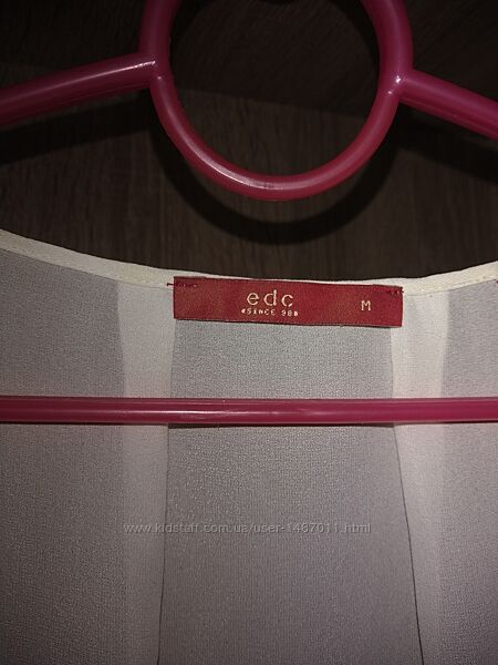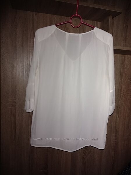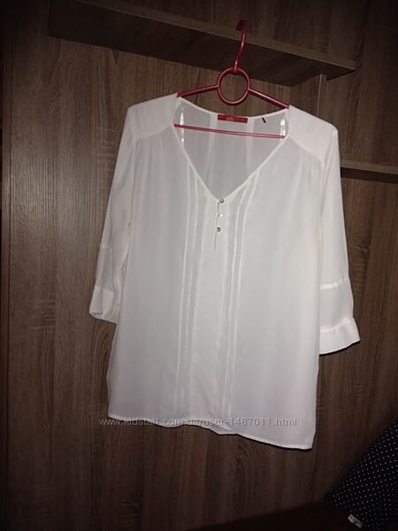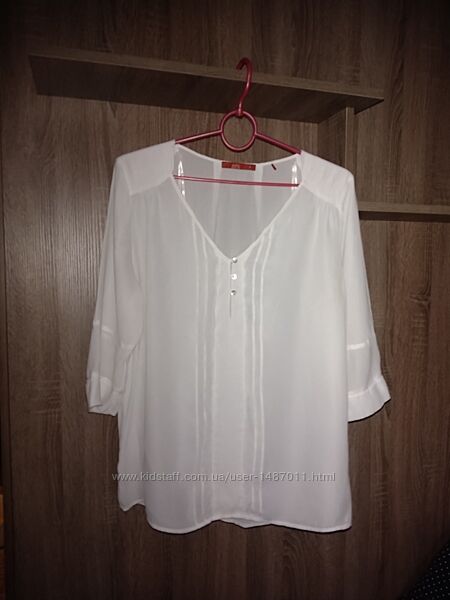 Блуза блузка кофта EDC женская белая. Размер на маркировке М, но по замерам - подойдёт и на 46 - 48 - 50 размеры. Материал - тонкая, мягкая полупрозрачная ткань. Не мнётся - после стирки не требует утюжки. Силуэт прямой, на кокетке, У - образный вырез горловины, рукав 3/4, застёжка вверху на пуговицы.Длина 70см, окружность груди 104см, окружность бёдер 110см, длина рукава 40см, ширина в плечах 42см.