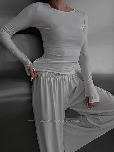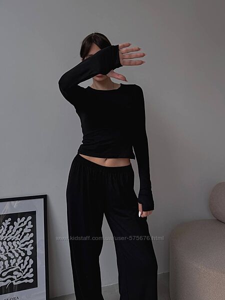Стильна базова трійка для весняних та літніх прогулянок: ідеальний крій, базові кольори та натуральна тканина. Футболка скімс, штани палаццо вільного крою та лонгслів з вирізами для пальчиків.