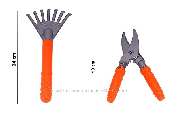 У наборі: тачка, лійка, відерко, секатор, совок, граблі, сапка.