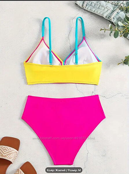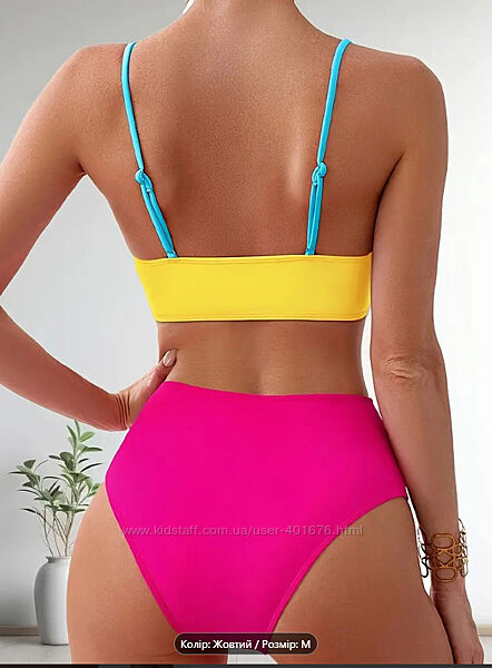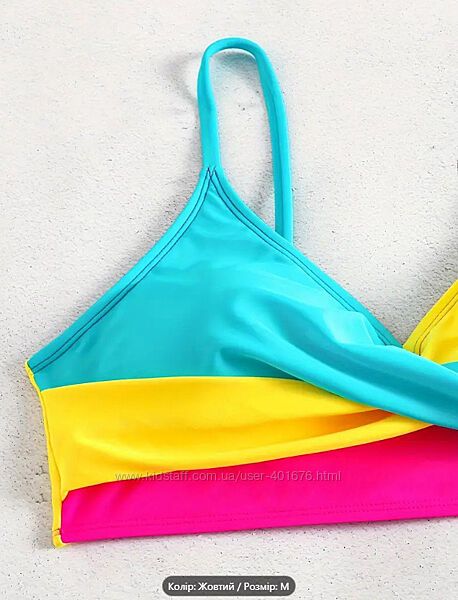 9152Красивый, раздельный женский купальник, в лиф вставляются вкладыши чашки без косточек, купальник комбинированный в cочетании желтого, розового и голубого, хорошо тянется. Лиф сплошной без застежки, бретельки регулируются.