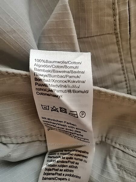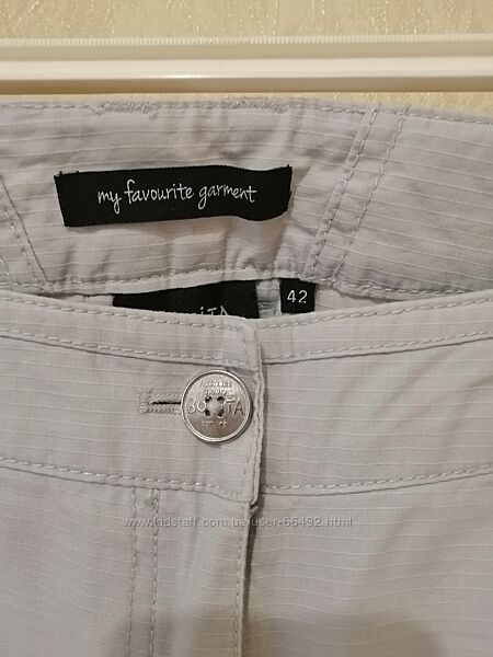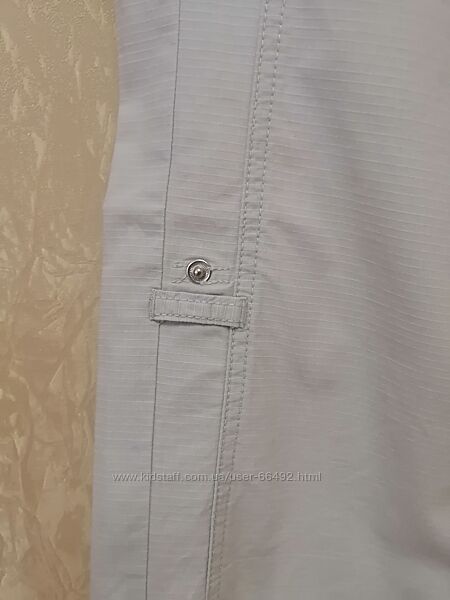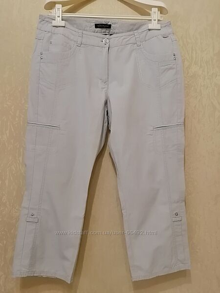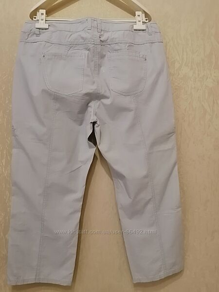 Колір світлий сірий. Бавовна 100 %. Тканина фактурна. Якість крою, тканини, пошиття бездоганна. Є тканинні фіксатори, їх можна застібнути та зробити бріджі ще коротші.