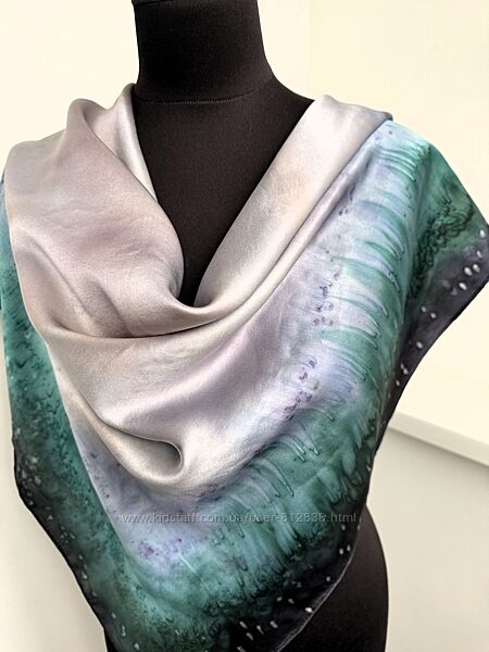 Красива атласна хустка в холодних тонах виконана в техніці ручного фарбування в стилі градієнт (перехід з одного кольору в інший). Перлинні відтінки плавно переходять у холодну зелень.Стиль мінімалізм - спокійні відтінки, чіткі лінії.