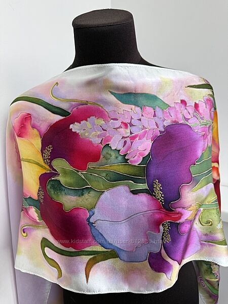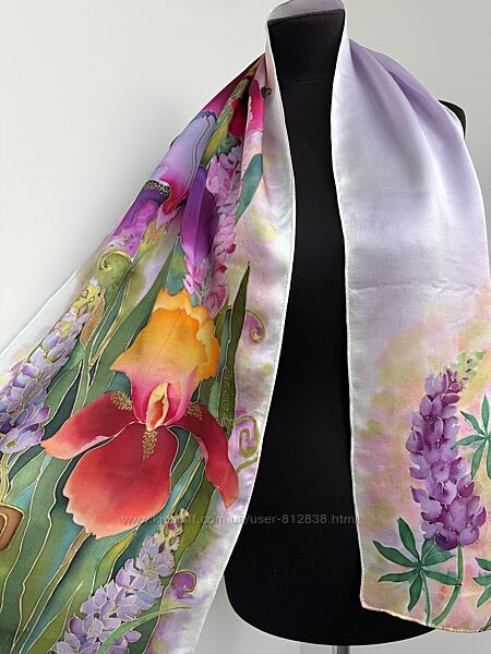 Подробное описание: Ручний розпис шовковий шалик Іриси та люпин атласний шовк.