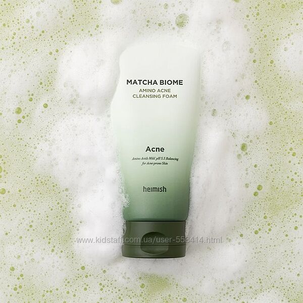 Heimish Matcha Biome Amino Acne Cleansing Foam — ніжна кремова пінка з екстрактом Матча та пробіотиками для догляду за проблемною шкірою!Пінка м´яко та делікатно очищає дерму, відлущуючи ороговілі частинки, видаляє надлишки себуму, залишки макіяжу та інші забруднення, закупорювальні пори, і, крім того, має протизапальну якість, допомагає зняти подразнення й надає заспокійлива дія. Пінка має слабокислотний pH (5.5), який нейтралізує агресивний вплив проточної води, зволожує й не викликає сухості та почуття стягнутості після вмивання.