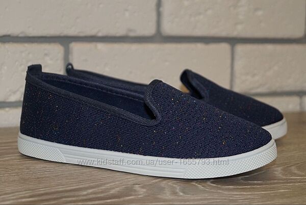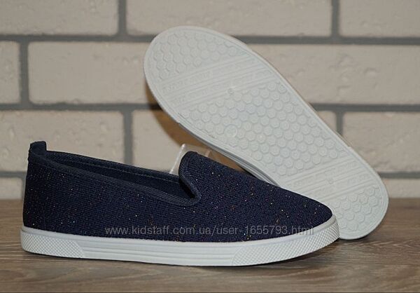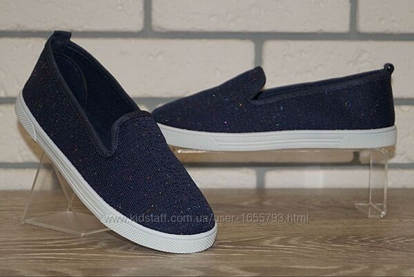 Новинка! Оригінальна модель дитячих сліпонів темно-синього кольору. Якісні, легкі та комфортні, чудово підійдуть для активного щоденного носіння.Пошиті із якісного взуттєвого текстилю з додаванням люрексової нитки. Всередині текстильна підкладка та устілка. Максимально легкі та гнучкі – не обмежують рухів.