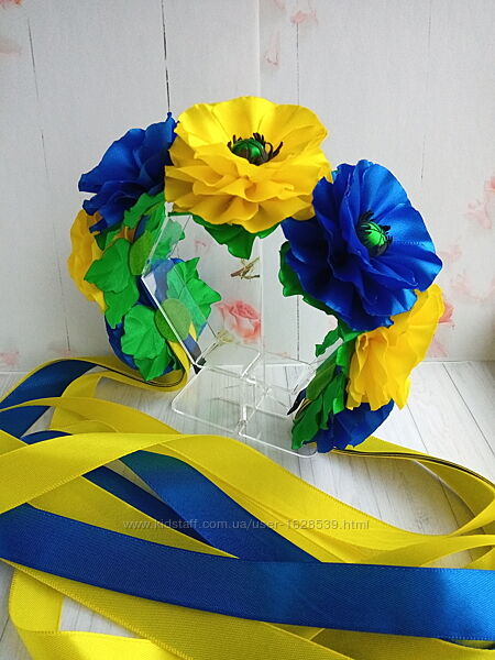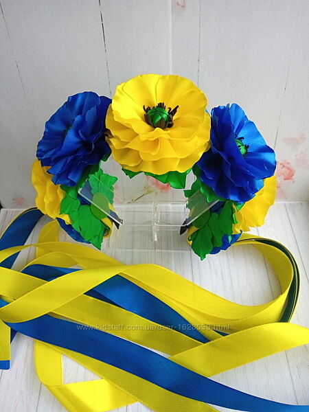 Пишний вінок з маками у патріотичних кольорах. Легкий та яскравий.Розмір обруча універсальний, підійде як для дітей так і для дорослих. Гарний атрибут для фотосесії та свят. Діаметр квітки 8 см. В наявності.