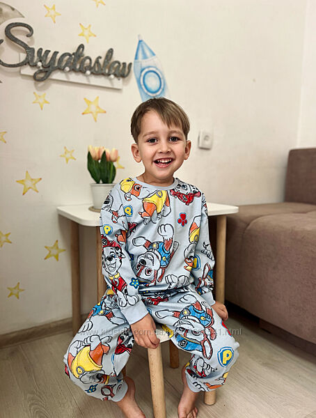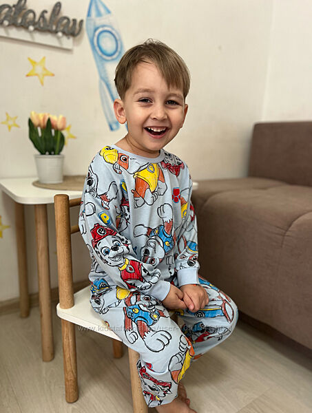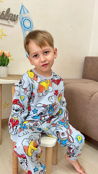 Дитячі трикотажні демісезонні піжами . Штани на резинці і ковта на довгий рукав , з принтом патрульВІК 3-4 ( ) 4-5 р ( кофта ПОГ- 36 см спина - 45 см рукав -33 см штани талія- 23 см довжина- 63 см шаг- 45 см ) ВІК 5-6 р кофта ПОГ- 37 см спина - 46 см рукав - 36 см штани талія - 25 см довжина - 67 см шаг - 48 см ) ВІК 6-7 р кофта ПОГ- 38 см рукав - 41 см спина - 50 см штани талія - 26 см довжина - 73 см шаг - 51 см)ВІК 7-8 р кофта ПОГ- 39 см спина - 51 см рукав - 43 см,штани талія - 27 см довжина - 75 см шаг - 57 см) ВІК 9-10р кофта ПОГ- 41 см спина - 57 см рукав - 45 см,штани талія - 28 см довжина - 84 см шаг - 60 см)