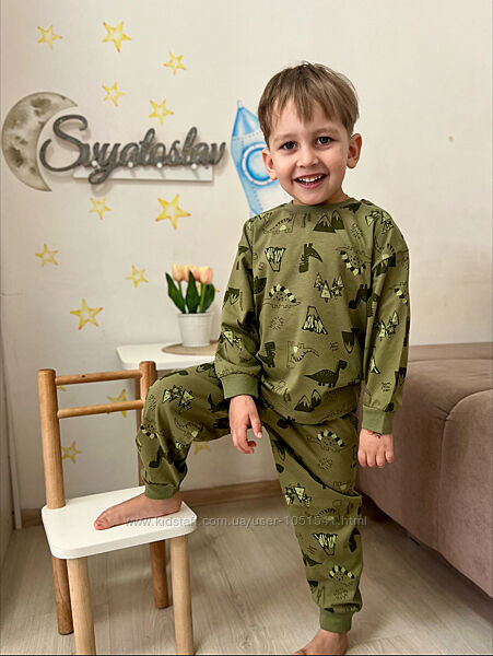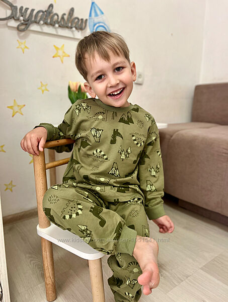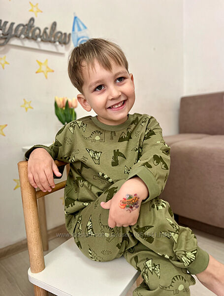 Дитячі трикотажні демісезонні піжами . Штани на резинці і ковта на довгий рукав , з принтом ДіноВІК 3-4 ( ) 4-5 р ( кофта ПОГ- 36 см спина - 45 см рукав -33 см штани талія- 23 см довжина- 63 см шаг- 45 см ) ВІК 5-6 р кофта ПОГ- 37 см спина - 46 см рукав - 36 см штани талія - 25 см довжина - 67 см шаг - 48 см ) ВІК 6-7 р кофта ПОГ- 38 см рукав - 41 см спина - 50 см штани талія - 26 см довжина - 73 см шаг - 51 см)ВІК 7-8 р кофта ПОГ- 39 см спина - 51 см рукав - 43 см,штани талія - 27 см довжина - 75 см шаг - 57 см) ВІК 9-10р кофта ПОГ- 41 см спина - 57 см рукав - 45 см,штани талія - 28 см довжина - 84 см шаг - 60 см)