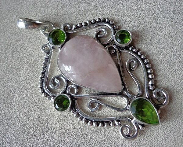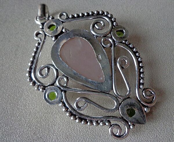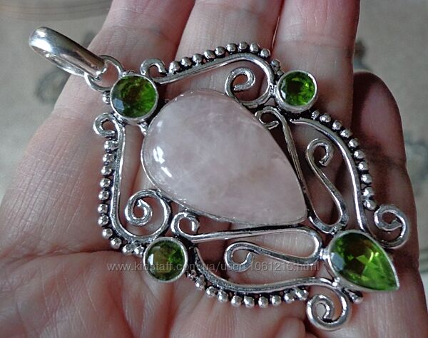 Підвіс рожевий та зелений кварц . Розмір камня 30 х 20 мм . Розмір кулона 70 х 40 мм . Посріблення , клеймо 925 . Індія . Дефектів не маэ э не велика природня слоїстість камня . Відповім на усі запитання .Предложения Premium магазинов