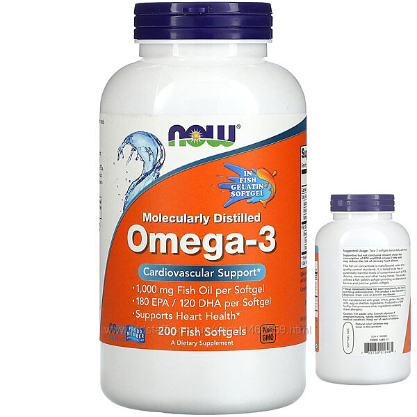 NOW Foods омега-3 1000 мг 200 капсул із риб´ячого желатину 1000 мг в 1 капсулі Рибій жир 180 ЕПК і 120 ДГК сердца рибій жирОпис