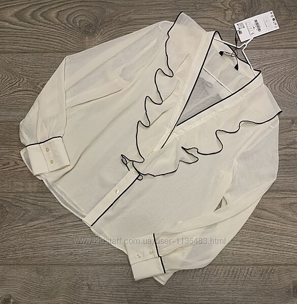 Блуза/сорочка Zara р. S/36/8 - підійде також на р. М/38/10Блуза з воланами та контрастною окантовкою, C- подібний виріз, манжет, спереду є підкладка, колір молочний.