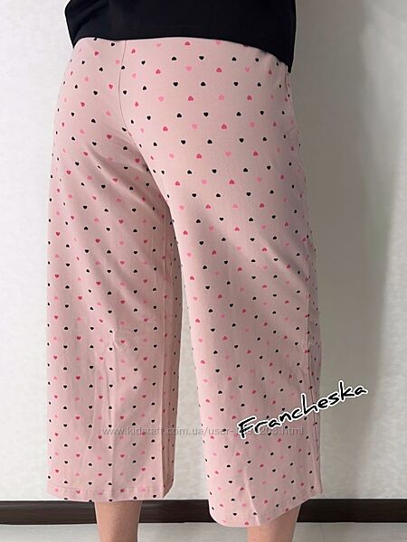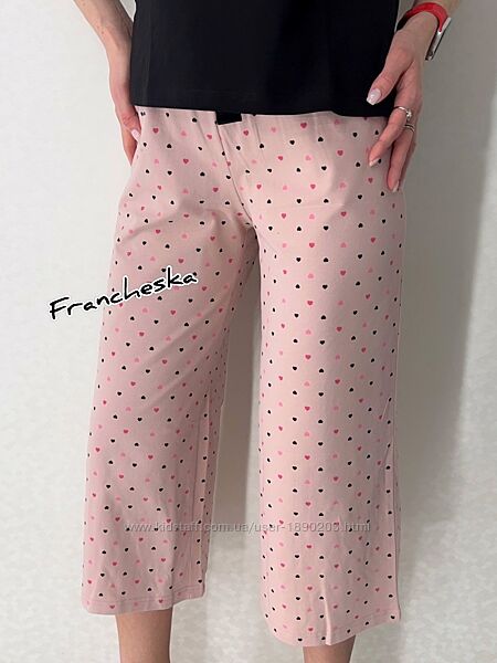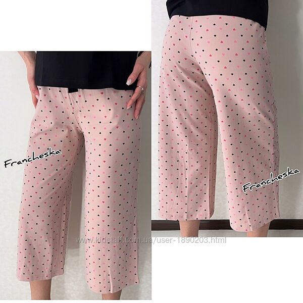 Жіноча піжама з капры (бриджами) з колекції "JUST BELIEVE" (LPK 2989/12/01) від українського виробника ELLEN можна купити в нашому інтернет магазині Francheska.Жіночий домашній комплект (піжама) виконана з якісної бавовняної тканини. Складається з чорної однотонної футболки з коротким рукавом і бриджів вільного крою. Капрі в принт із різнокольорових сердець, з м´якою гумкою в поясі, прикрашені стрічкою чорного кольору.Комплект дуже красивий, комфортний і приємний до тіла, також буде зручним одягом для дому або корисним подарунком коханій та близькій людині.