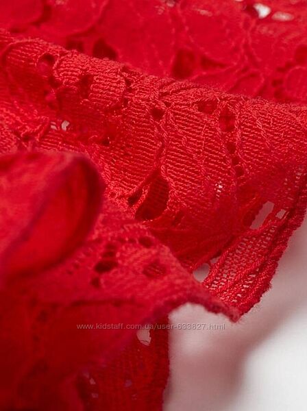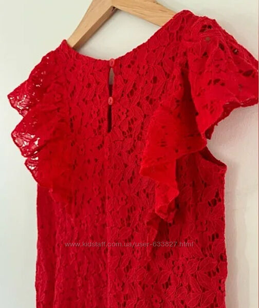 Мереживна сукня без рукавів з оборками зверху, які продовжуються на плечах, з вирізом і застібкою на гудзик на шиї. З підкладкоюВ наявності повномірний 98/104р. на 3/4 роки