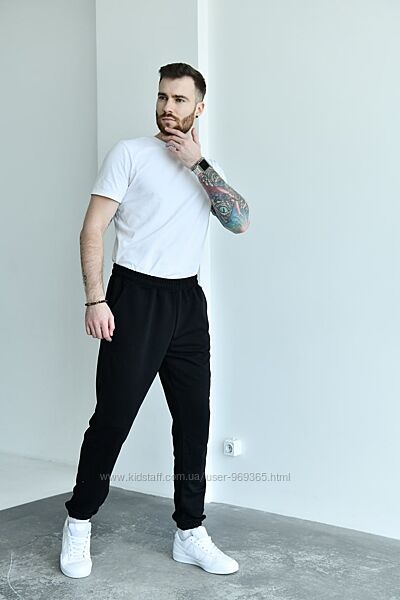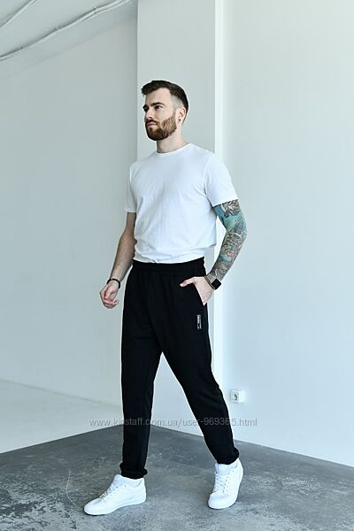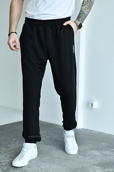 Чоловічі спортивні штани із трикотажу двонитки ( розтяжність середня). По талії забрані на резинку, в куліску протягнуто шнурок, посадка середня. В бічних швах оброблені кишені. Низ штанів на резинці. Декоровані нашивкою.