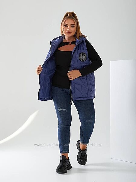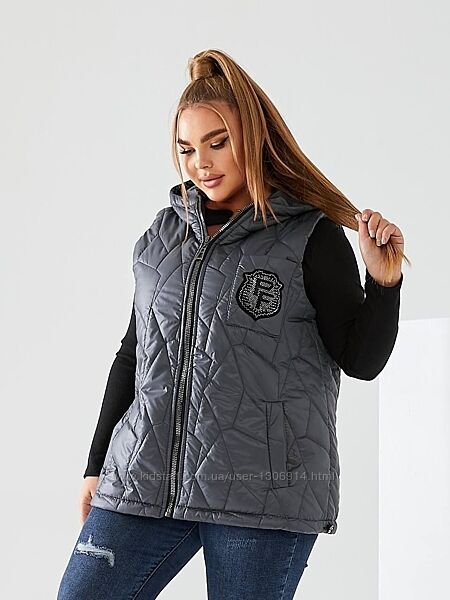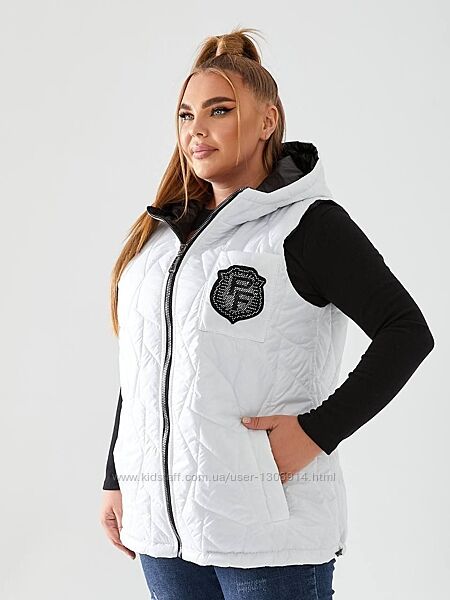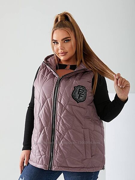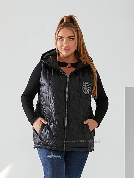 Стильний стьобаний жилет з кишенями, зручний глибокий капюшон, декорована нашивкою з камінням, якісна фурнітура.
