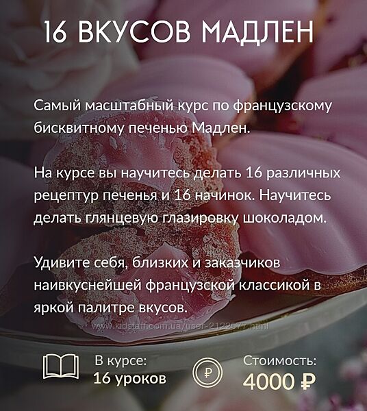 Курс состоит из 16 вкусов французского бисквитного печенья. Это различное тесто и абсолютно разные и самые вкусные начинки.