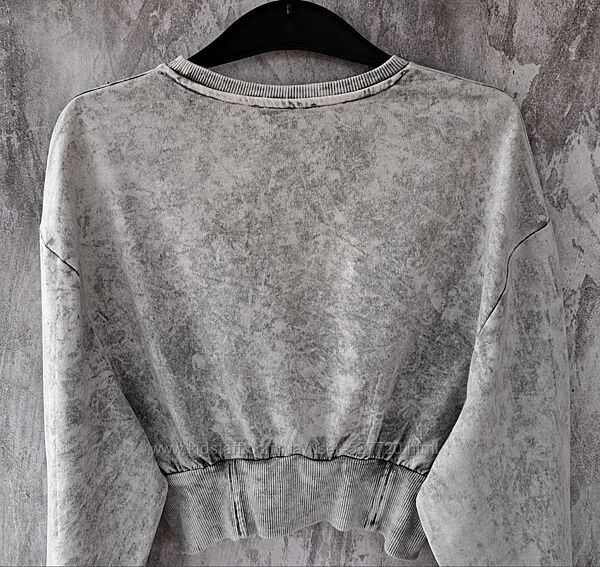 наличие уточняйте пожалуйстаЖенский трикотажный свитшот кроп-топ с буквенным принтом. Плечевой шов приспущенный, рукав на манжетах, низ изделия на широком манжете.