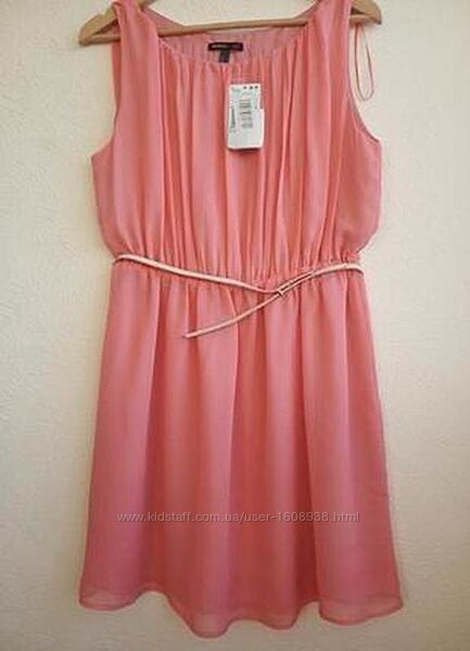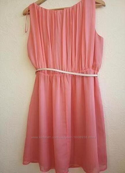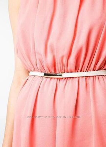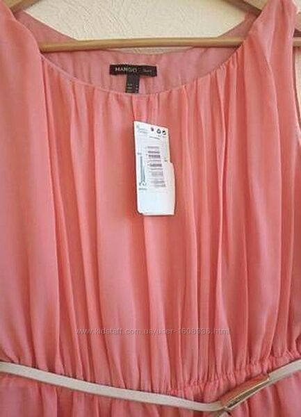 Плаття Mango світло-коралового кольору. Пошите з шифонової тканини, на підкладці. Верх сукні присобраний, пояс на резинці. Розмір L. Підійде на М-L. Заміри: висота сукні 90 см, висота верху 41 см, висота нижньої частини 49 см, ПОГ 51 см, ПОТ 38 см. Сукня має пояс з металевою застібкою золотого кольору. Склад: 100% polyester.