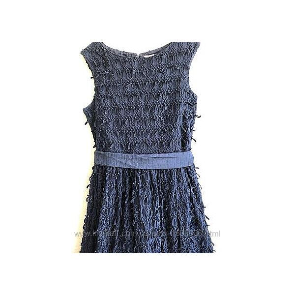 Нарядне плаття OVS темно-синього кольору.для дівчинки. Застібається на молнію, прикрашене поясом. Зверху тканина прозора в малюнок з цяточками, знизу натуральна тканина та юбка з добааленим об´ємом. Розмір 12-13 років 158 зріст. Верхня ткпнина 100% poliester, Нижня тканина 100% cotton. Заміри: Висота 85 см, ПОГ 38см, ПОТ 37 см, пройма рукава 16, 5 см.