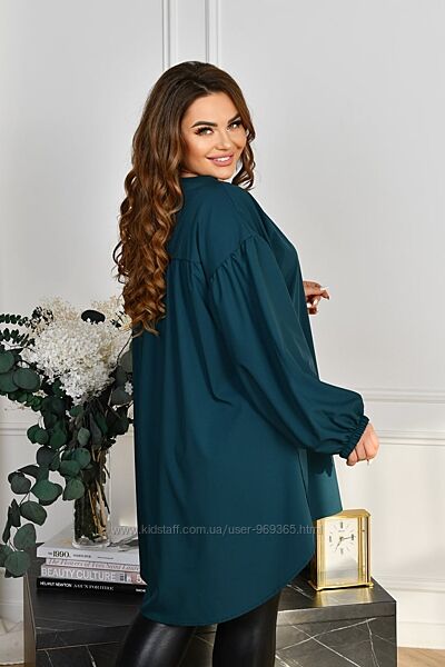 Туніка вільного силуету із легкого та приємного софту (розтяжності немає). Лінія плеча спущена, рукав по низу зібраний на резинку. Виріз горловини круглий, широкий, попереду декорований краплеподібним розрізом. Кишень та застібок немає.