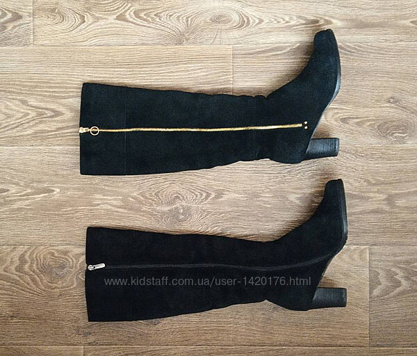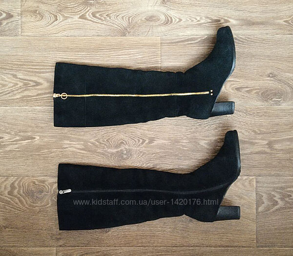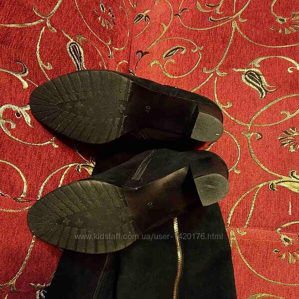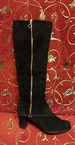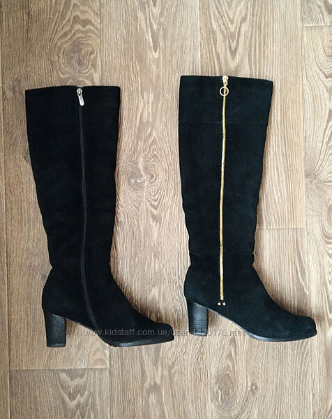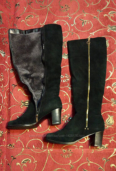 Зимові чоботи, натуральна замша, всередині штучне хутро, в хорошому стані, замки робочі. Розмір 39-40, устілка 25,5см, каблук 6,8см, висота чобіт 44см, ширина халяви зверху 38см.
